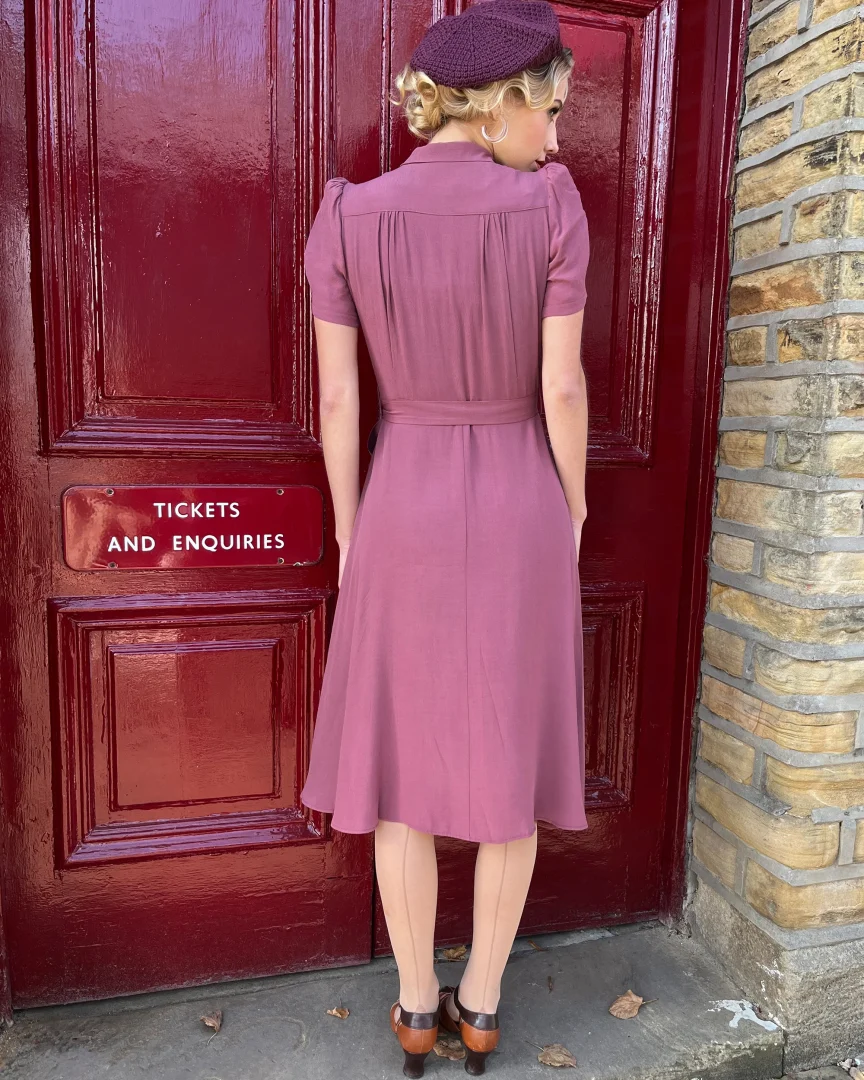 For klassisk og diskret antrekk fra 1940-tallet – denne stilen knepper helt opp til toppen med knapp og hempe, eller kan brukes mer åpen. Knappene er en fantastisk reproduksjon av en original knapp fra 1930-tallet og har en art deco-følelse. Kjolen har et klassisk ikonisk skulderbærestykke med rynker over bysten som faller fint ned i midjen. Spenn den ytterligere med et belte.