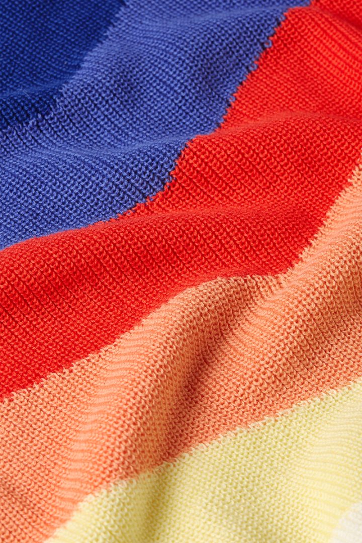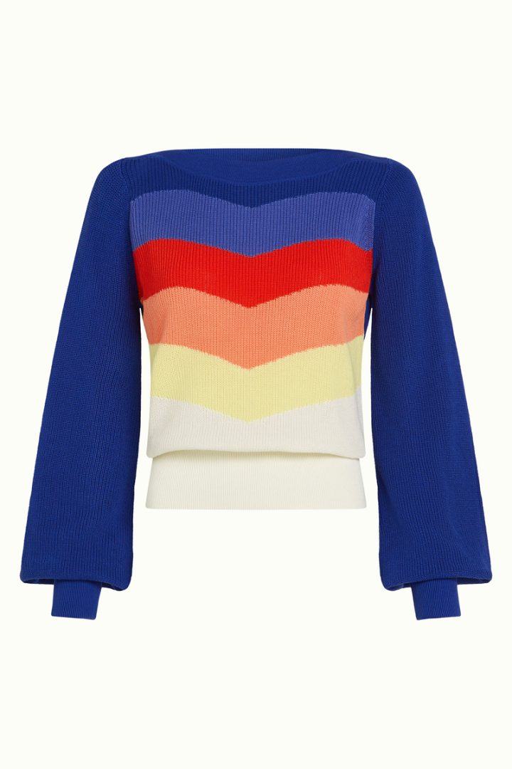 Denne kule 70talls toppen fra King Louie har lange, klokkeformede ermer med mansjetter og er laget av elastisk viskosestrikk. Medrafiske trykk og båthalsdesign