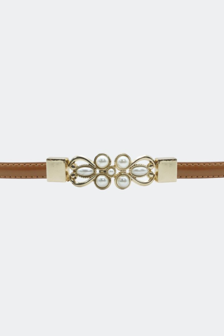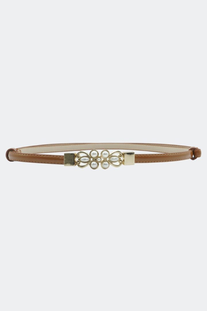 Smalt brunt belte i vintage-stil med perlespenne og gullfargede metalldetaljer. Måler 1 cm i bredden og har justerbar midje for perfekt passform.