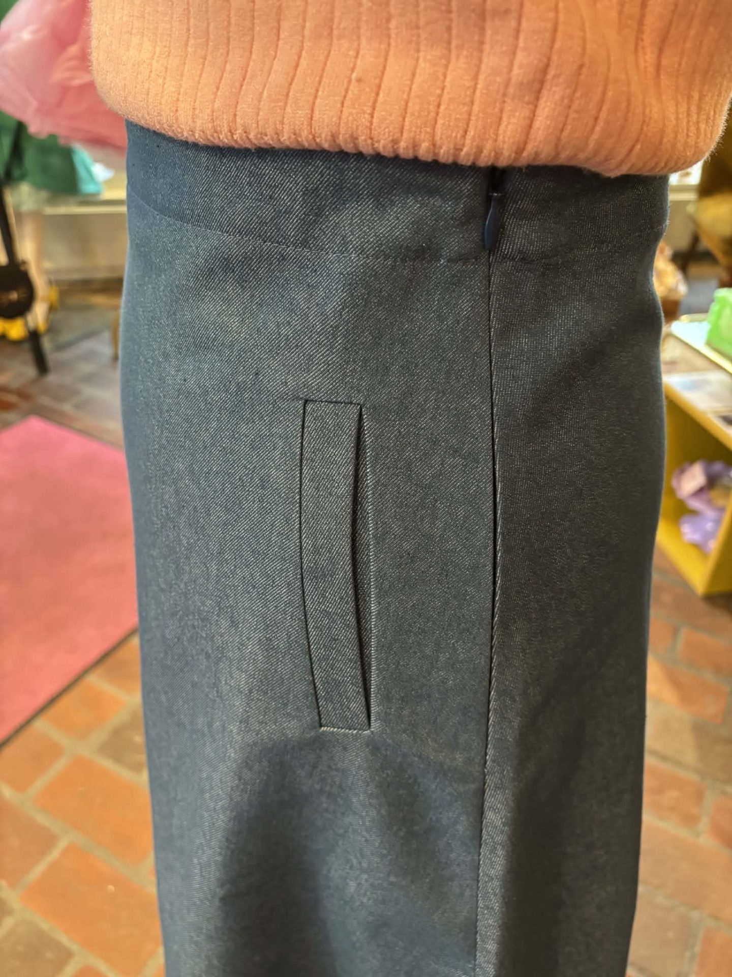 Skjørtet har fast linning, glidelås i sidesømmen og stikklommer.