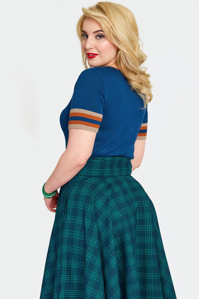 50-talls strikket genser fra Voodo Vixen med vintage revetrykk, blå farge, rund hals, korte ermer med stripete ribbekanter.