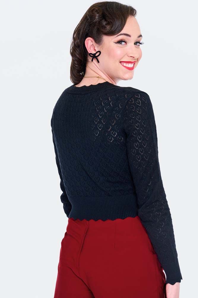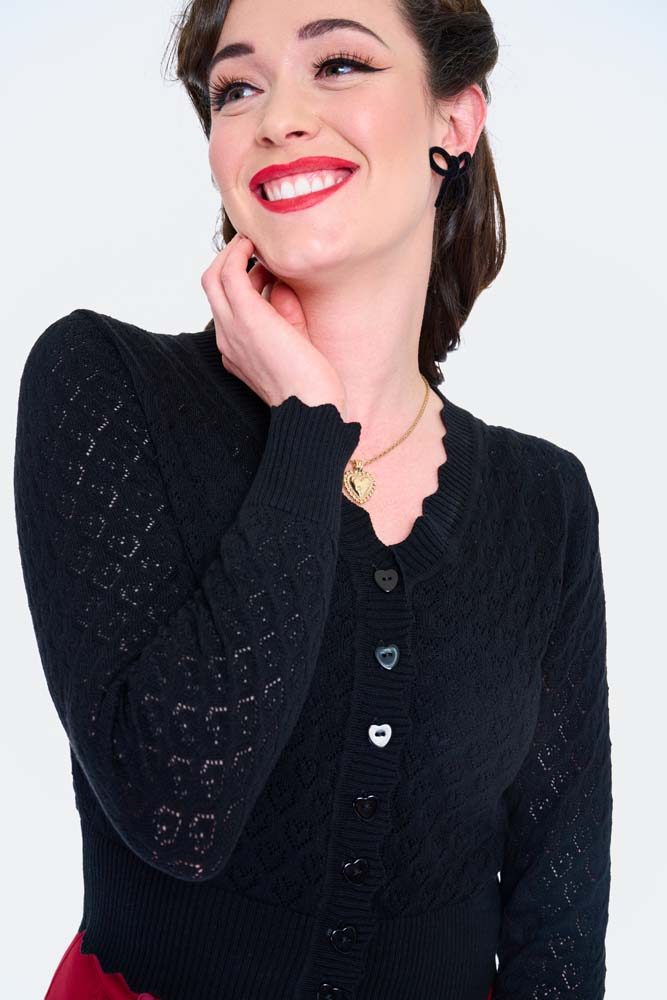 Langermet, hjertemønstret strikket cardigan med V-hals, hjerteformede knapper og kamskjellkant.