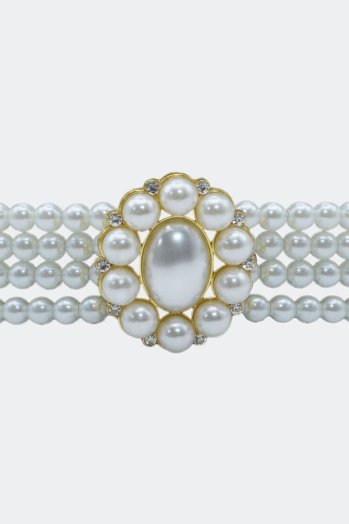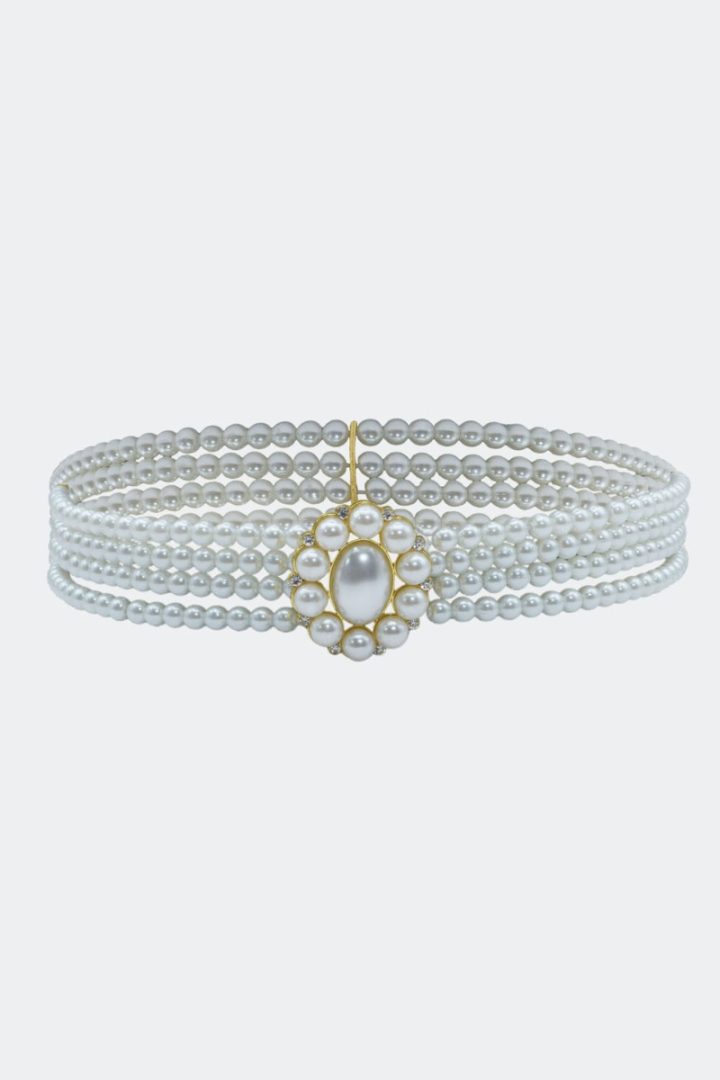 Vintageinspirert elastisk belte fra Voodoo Vixen i kunstperler med fire perlekjeder og en stor perlespenne. Måler 3,3 cm i bredden.