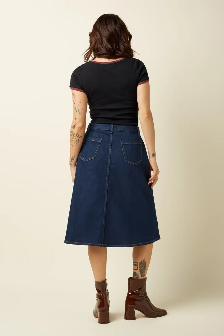 Marie-skjørtet Onyx Denim våger å skille seg ut med sin mellomhøye midje og lett utsvingte midilengde. Laget av vevd bomull med komfortabel stretch, har det en normal passform forsterket av skrå lommer og en linning med beltehemper. Knappelukkingen fullfører dette dristige, stilige plagget.