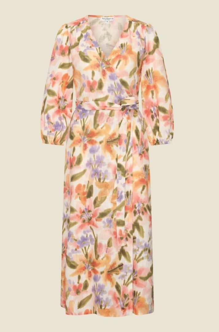 Elegant og tidløs omslagskjole med pastellfarget blomsterprint fra Very Cherry!