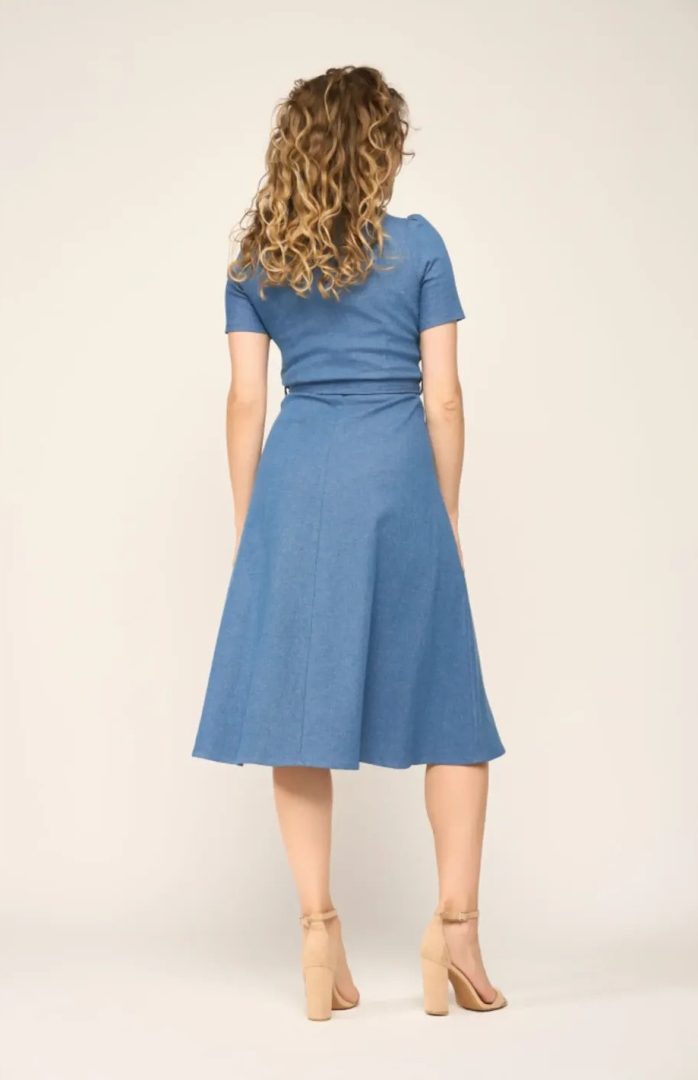 har en tettsittende overdel og et utsvingt skjørt. Den fremhever midjen vakkert, noe som gjør den feminin og utrolig behagelig å ha på seg. Den har slagkrage, korte ermer, knappelukking foran og glidelås på siden. Den har også to lommer og et matchende knytebelte